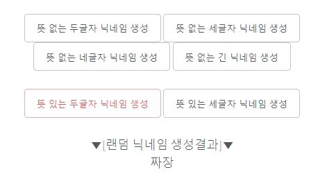 그럼 두글자 닉네임 생성기를 이용해보겠습니다. 말그대로 두글자의 닉네임을 생성해주는 기능을 합니다. [닉네임 생성] 버튼을 누르시면 랜덤으로 생성되며, 두글자 뿐만아니라 세글자나 네글자 및 긴글자의 닉네임도 생성할 수 있습니다.