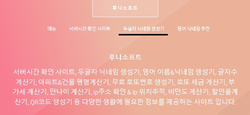 후니소프트 홈페이지에 접속해서 두글자 닉네임 생성기 서비스를 이용해보도록 하겠습니다. 포털 또는 검색엔진 등을 활용하여 검색하시면 사이트 바로가기를 통할 수 있는데요, 다양한 계산기들을 이용해볼 수 있습니다. 메인화면 상단에는 메뉴, 서버시간 확인 사이트, 두글자 닉네임 생성기, 영어 닉네임 추천 메뉴가 있어요.